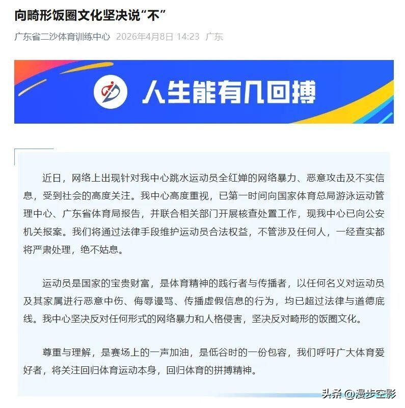 转机出现在2026年4月8日,这一天,广东省二沙体育训练中心甩出一份声明,标题就叫《向畸形饭圈文化坚决说“不”》。