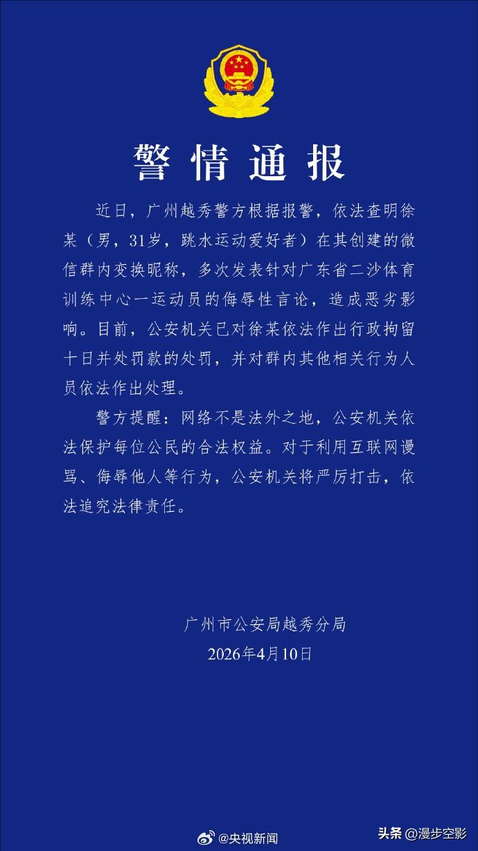 2026年4月10日,广州警方正式发布通报。徐某被抓了——31岁,职业身份为跳水运动爱好者。这个身份让所有人都愣了一秒。一个热爱跳水的爱好者,本该比任何人都懂得运动员背后的汗水,却成了霸凌群的创建者。这个反差,比任何说教都更有冲击力。