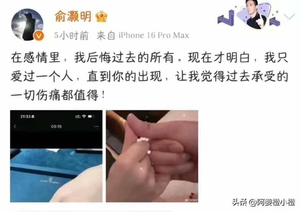 2025年5月17日凌晨,俞灏明晒出钻戒特写和拉钩照,配文深情告白:“直到你的出现,让我觉得过去承受的一切伤痛都值得!”