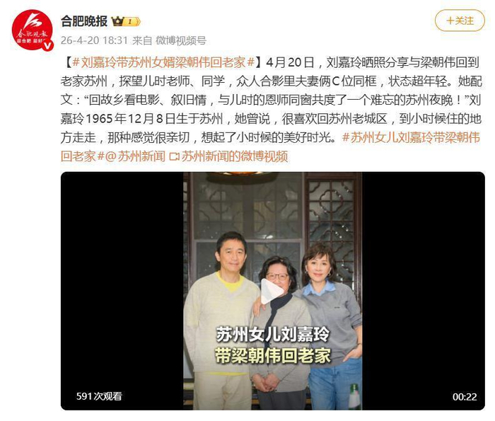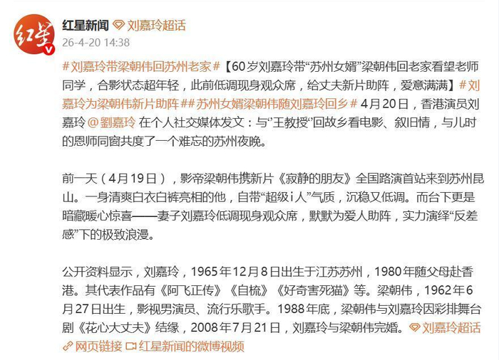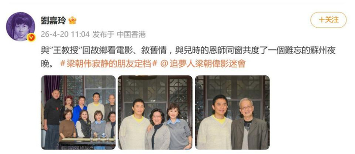 4月20日,刘嘉玲在个人微博的一则发文,瞬间暖到了无数网友。她写道:“与王教授回故乡看电影、叙旧情,与儿时的恩师同窗共度了一个难忘的苏州夜晚”。这对娱乐圈的模范夫妻,把一次工作行程,过成了温馨的故乡探亲之旅。