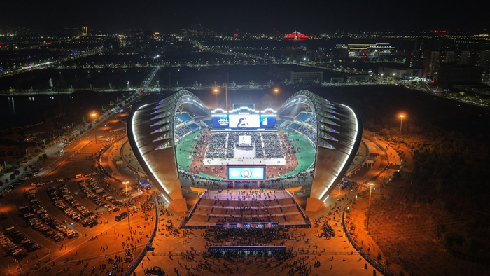 夜幕轻垂,华灯如昼,黄冈市体育中心体育场人潮如织、光影交错、声浪叠涌。