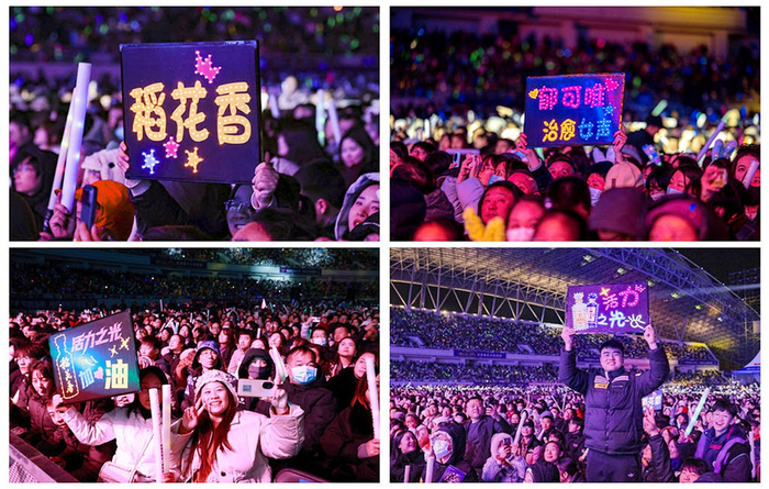 当天下午四点半,寒意渐浓,体育场外已聚满热情的观众,每张脸庞都闪烁着兴奋的光芒,只为奔赴这场与音乐、与偶像的活力之约。演唱会现场,粉丝们热情参与互动,高举的灯牌在人群中闪亮、挥舞的荧光棒划出跃动的轨迹、点亮的手机汇成一片星海、闪烁的发饰在夜色中绽放微光……他们用自己的方式支持爱豆。现场灯光与星光相互交织,歌声与欢笑激情碰撞,活力与梦想扬帆启航。