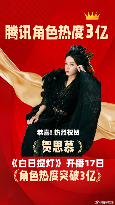 迪丽热巴在腾讯视频女性角色热度榜上演了一场“霸榜神话”——其主演的古装奇幻剧《白日提灯》中“贺思慕”角色热度值以破纪录速度突破3亿,登顶2026年平台角色总榜首位,更罕见包揽热度榜前十中的三席,成为年度现象级角色。