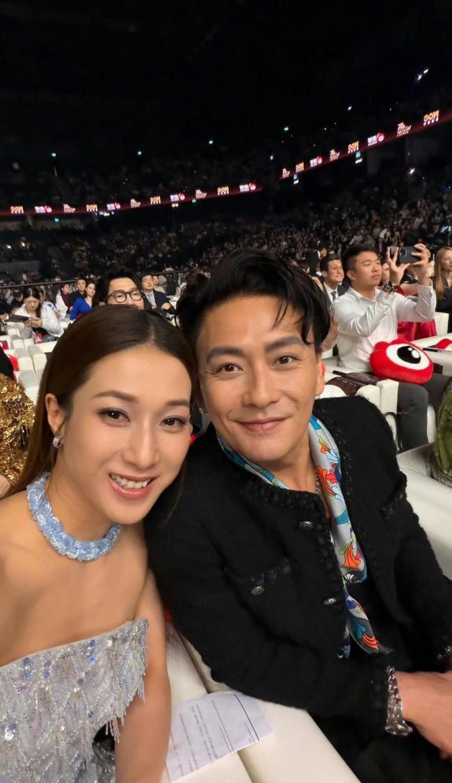 钟嘉欣在颁奖典礼上遇到黄宗泽时又带来了一种不同的情绪。当年他们合作次数多、默契度好,在观众看来自然就成了经典的荧幕搭档。这次同台亮相,大家的注意力一下子转移过去了。钟嘉欣主动和黄宗泽合照,并且拿手机自拍,两人面对镜头都很放松地笑出声来,距离也不算太远,没有刻意拉开的样子。粉丝看到这一幕自然兴奋。