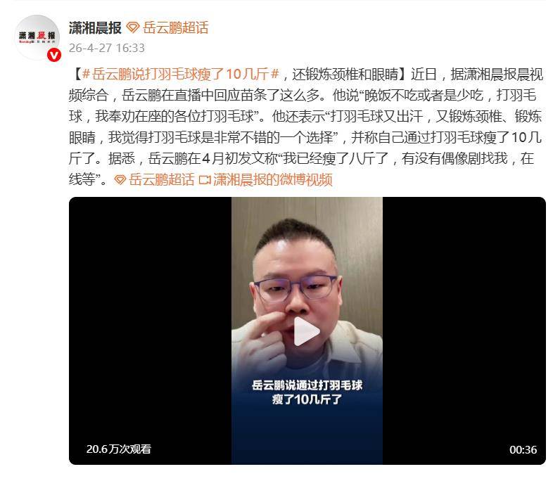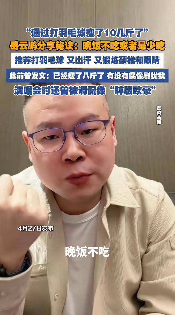 据4月27日报道,岳云鹏在直播中大方回应了自己“苗条了这么多”的秘密,一句“晚饭不吃或者是少吃,打羽毛球”直接冲上了热搜。这位一向以“萌胖”形象深入人心的相声演员,突然开始卷身材管理了,网友们的第一反应不是惊讶,而是调侃:“这是准备转型当爱豆了?”