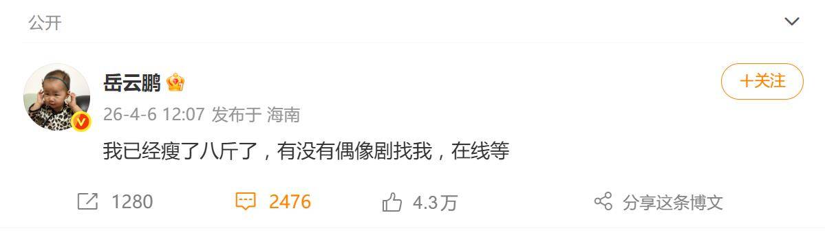 其实,岳云鹏这次的身材管理,早就有迹可循。就在4月初,他就在社交平台上发文“凡尔赛”了一把:“我已经瘦了八斤了,有没有偶像剧找我,在线等。”这赤裸裸的“求职宣言”,瞬间让评论区变成了“剧本征集处”。从“德云一哥”到“偶像剧预备役”,岳云鹏的这波操作,不仅是在减重,更是在拓宽自己的喜剧边界——谁说胖子就不能有偶像梦?