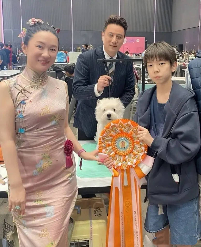 比赛当天,冠军犬主特意要求和霍思燕一家合影了,霍思燕穿着浅粉色旗袍、盘着头发,她素颜的模样很真实。