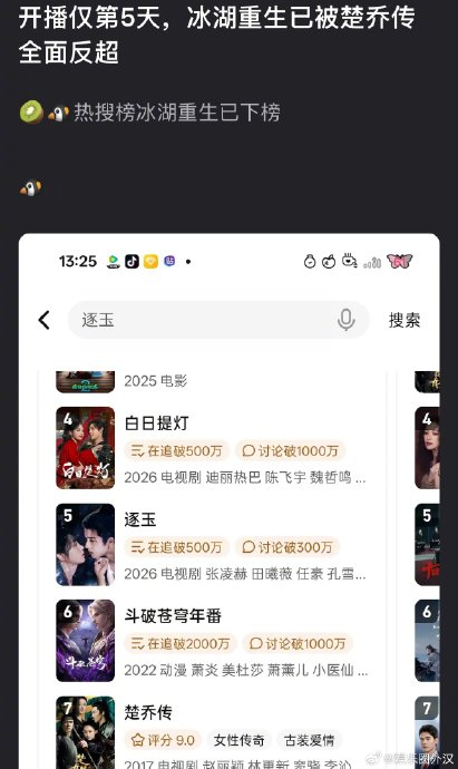 2026年4月初,《冰湖重生》作为《楚乔传》的“正统续作”开播,意外掀起一场反向文化浪潮——九年前的老剧《楚乔传》播放量单日暴涨300%,霸榜热搜,甚至反超新剧登顶平台榜单,形成“续集扑街,原作封神”的戏剧性现象。