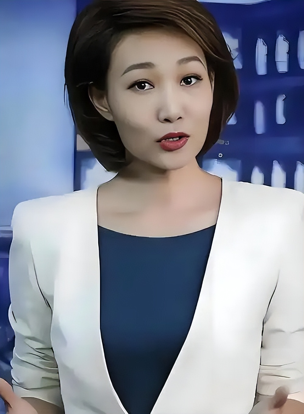 深色西装,发型一丝不苟,播音腔标准而沉稳。