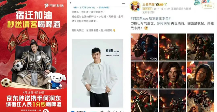 而助阵苏超只是何润东近期密集涌入的活动之一,在4月爆红以后,已经许久没有作品上映的何润东意外迎来了自己的“流量巅峰”。蓝鲸新闻记者统计,近半个月内何润东已经接到安慕希、洋河股份、支付宝、京东、王者荣耀等多个广告商务活动,覆盖了消费品、互联网平台,着实算得上流量事业双丰收。
