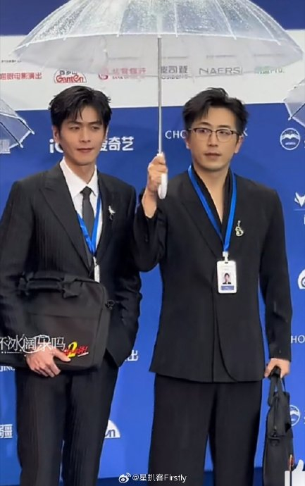 红毯当日突降大雨,白客迅速为张若昀撑起透明雨伞,自己半边身体暴露在雨中。这一自然举动因两人造型的“职场化设计”被赋予戏剧张力:两人均佩戴工牌、手夹公文包,以“打工人”身份亮相红毯。当雨水与公文包相遇,“班味浓度超标”的调侃瞬间点燃网友创作欲,#白客给张若昀打伞#话题下涌现大量“红毯秒变上班现场”的段子。现场视频显示,白客撑伞时姿态娴熟,张若昀专注回应媒体,画面被慢镜头升格拍摄后更强化了“职场服务关系”的既视感。