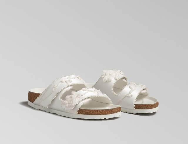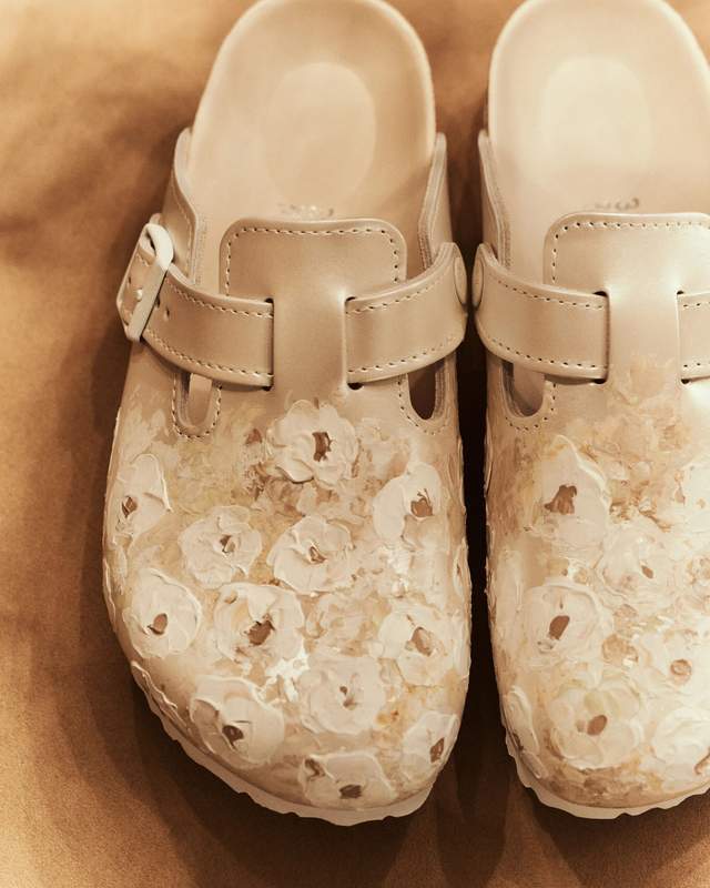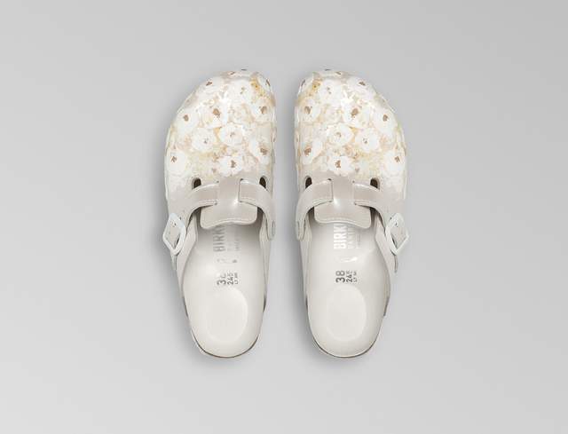 Birkenstock 经典的 Arizona 鞋款换上象牙白丝绮材质,上头还有细致珍珠滚边以及雪纺刺绣花卉点缀; 另一双以 Boston 鞋款为核心,搭配象牙色皮革,鞋面饰以订制手绘花卉图案,都让原先休闲轻便的鞋款变得好梦幻浪漫。