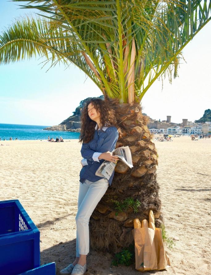 裤型是利落的直筒小脚款,刚好卡在脚踝上方,这样一来,轻轻松松就将纤细的脚踝露出来,视觉上特别显腿长,还能中和上半身衬衫的宽松感,让整体造型张弛有度。白色和蓝条纹的配色清爽又高级,压根就不挑肤色,日常穿也很百搭。脚上所穿鞋子是一脚蹬款式,鞋面带点低调的纹理设计,软乎乎的质感看着就舒服,平底款式走路完全无压力,不管是逛街还是海边散步都合适,和整体的松弛感完美契合。