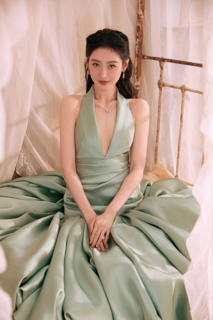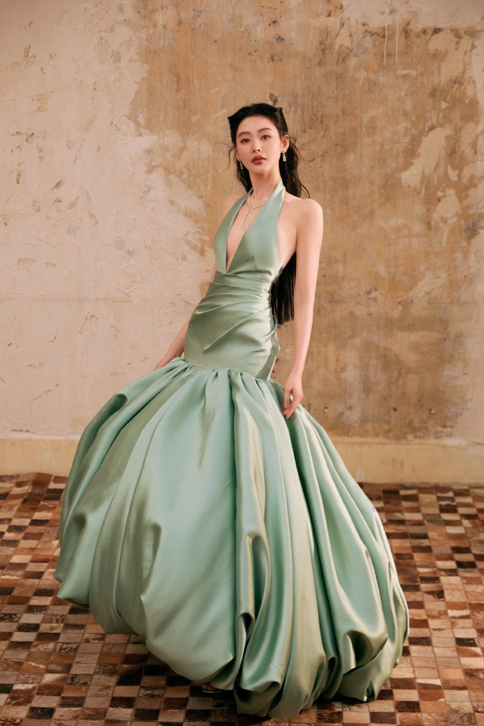先看她这一身连衣裙搭配,设计感十足的薄荷绿缎面挂脖鱼尾连衣裙本身就是一件对搭配要求极高的单品。低饱和度的薄荷绿自带清冷贵气,完全避开了高饱和亮色容易显俗艳的雷区,搭配自带柔光质感的缎面材质,在光影下泛着细腻的光泽,衬得张天爱皮肤冷白透亮,又让整体造型多了几分低调的高级感,和背景里复古斑驳的墙面形成了恰到好处的呼应,复古与现代感碰撞,氛围感直接拉满。
