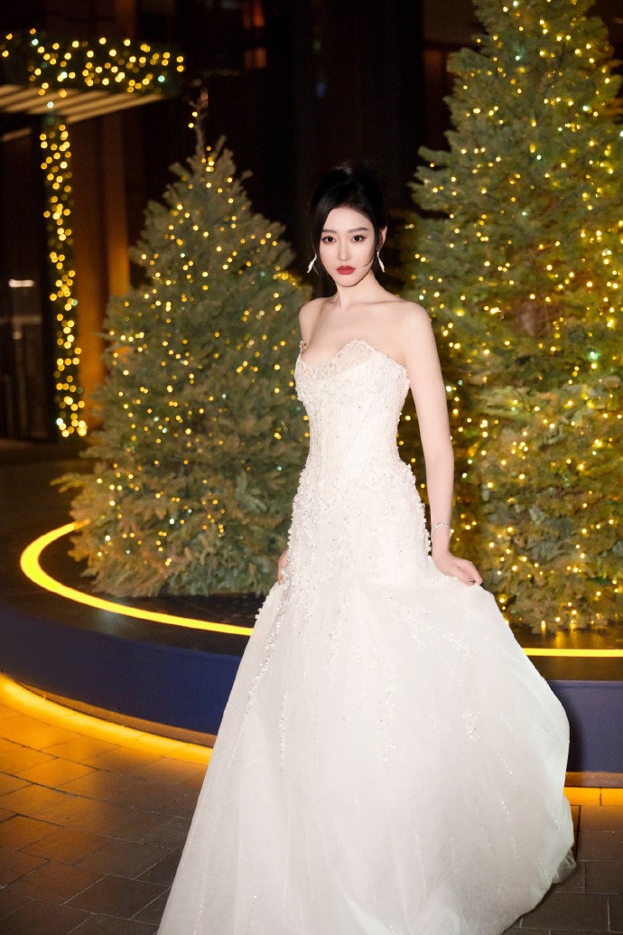 如果想要尝试温柔风搭配,可以看看她这一身连衣裙的造型,身穿自带柔光质感的白色薄纱抹胸连衣裙,在灯光下闪着细碎的星光,保留了白色礼服的纯洁感,又用精致的钉珠设计增添了贵气感,完全不会显得单调。