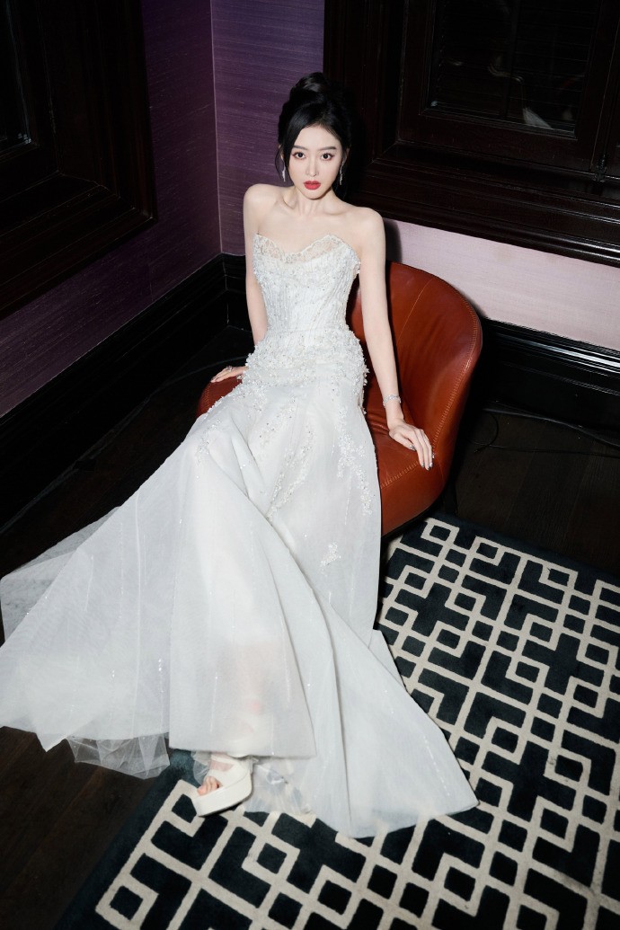 配饰的搭配更是加分不少,张天爱选择了极简的银色配饰,一条细钻项链顺着深 V 领口垂落,填补了胸前的空白,又不会抢了礼服的风头,反而和缎面的光泽感相得益彰,衬得颈部线条更加纤长。