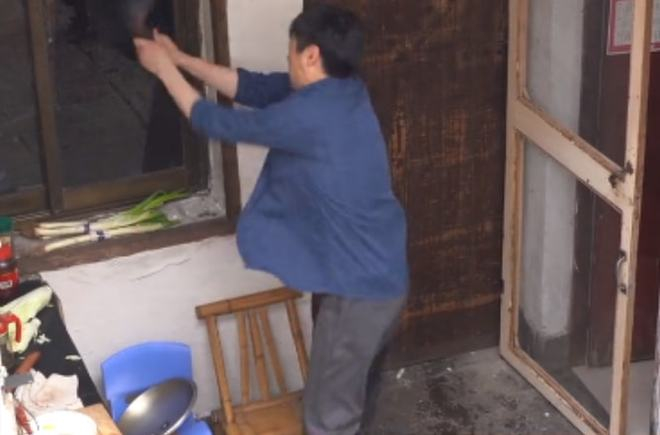 画面中,一群工作人员围在院子里做录制工作,47岁的祖峰身穿一件深蓝色长袖和灰色长裤,朴素的外形极其贴合人物形象。只听见一声开拍,两位演员迅速入戏,女演员扔下菜篮,立马跑回室内并反锁大门。