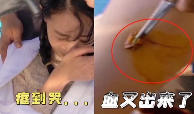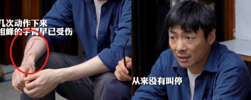 祖峰按照剧情走向,大力推拉大门又拿起铁锅疯狂砸向玻璃,但多次尝试以失败告终。随后祖峰主动要求想多尝试几次,从图片中可以感受出他双手紧抓铁锅,用劲敲打玻璃,却不料手臂被掉落的玻璃碎片划伤,瞬间血液涌出,场面有些焦灼。