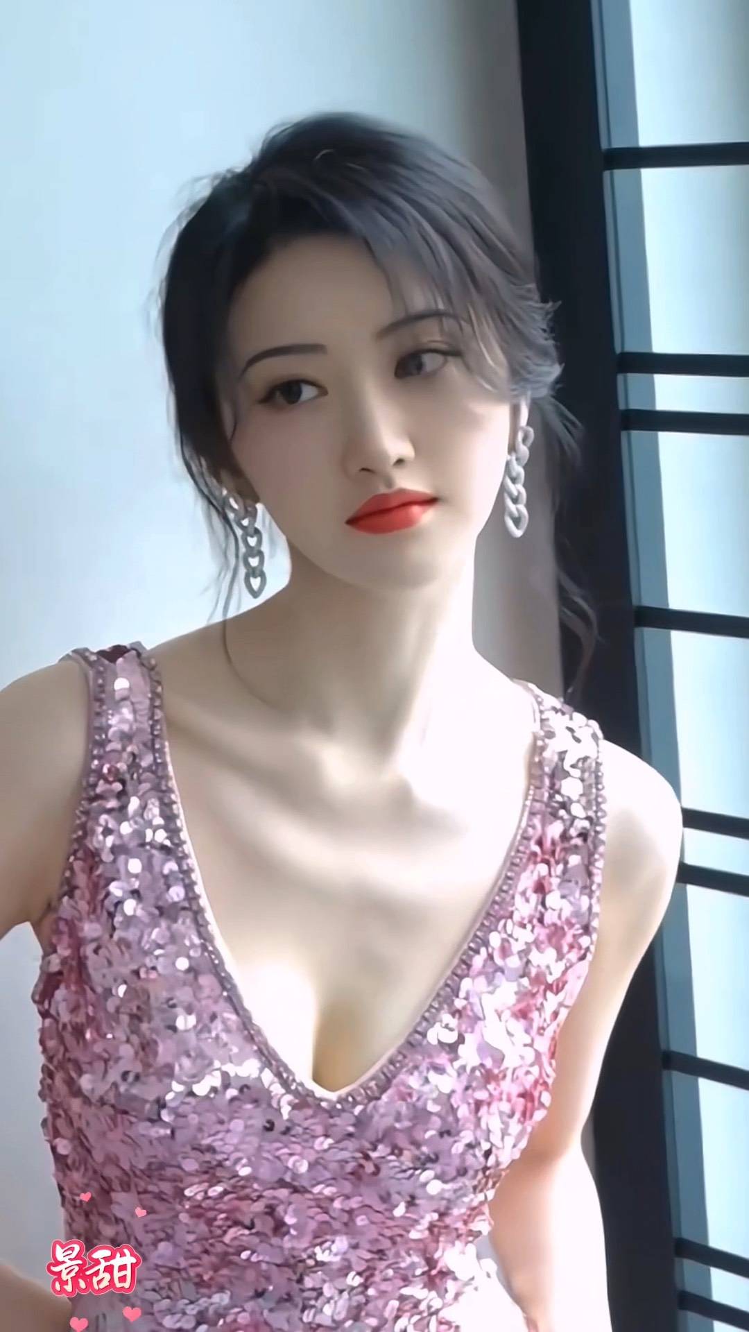 景甜穿着玫瑰红颜色的抹胸长裙,她侧身回眸很明艳动人,露出傲人的事业线,大秀玲珑的魔鬼身材,绝对性感火辣!