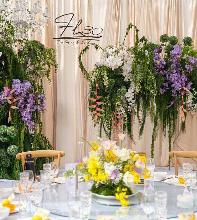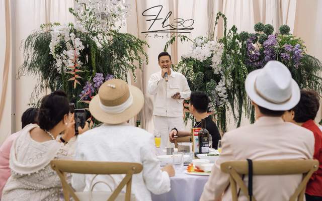 从曝光的画面中不难看出当天的主题并不是普通的聚会,而是范明与妻子厉玲的结婚30周年(帷幕上写着两人的名字拼音,另外还有一个数字30)。