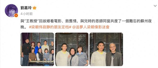 刘嘉玲与梁朝伟一同赴内地为电影宣传,这是两人此次返回内地的契机,而电影宣传在江浙一带,活动之后就顺带返回苏州的老家,与恩师与同学一起看电影,叙旧。刘嘉玲晒出了同学聚会的照片,大家相聚在一个别致的场合,一起品茶、吃饭、喝酒、聊天,好不愉快。从刘嘉玲晒出的合照来看,梁朝伟也在场,虽然他与刘嘉玲的同学、老师都不相识,但也终究是名人,在场内也颇受欢迎。合照的时候,刘嘉玲与恩师坐在前排的中间,60岁的刘嘉玲保养得宜,这就不说了,没想到她的老师看起来也颇为年轻,气质也相当出众。