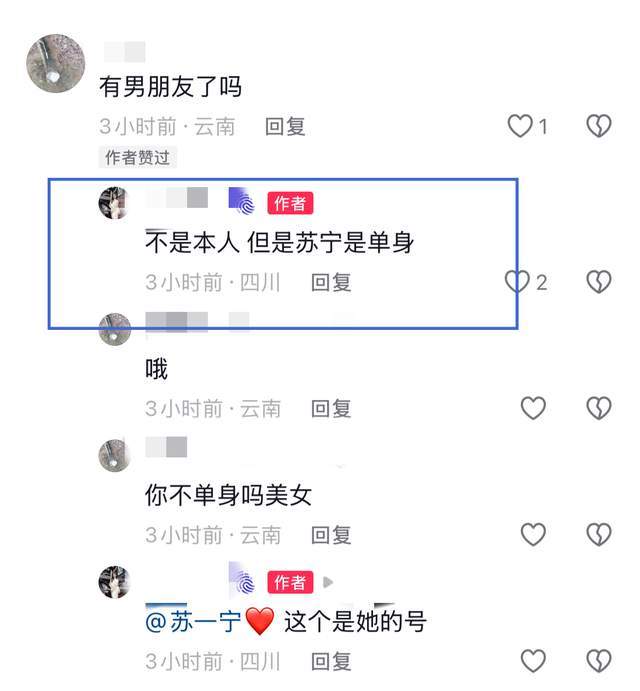 有网友询问该铁粉:有男朋友了吗?她则表示:不是本人,但是苏宁单身。