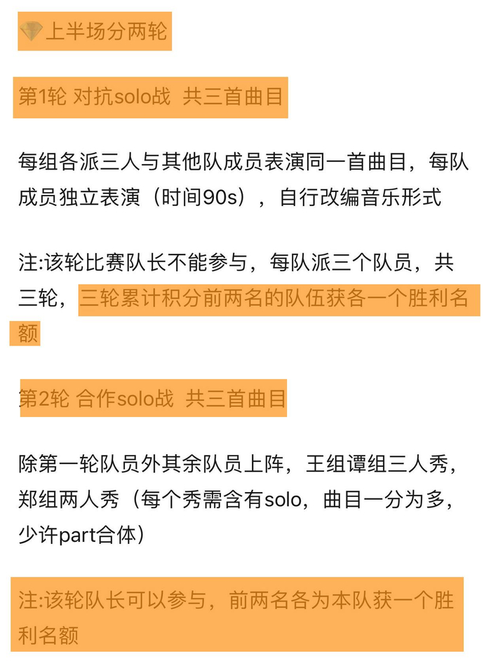 总决赛上半场分为两轮对决,第一轮是对抗solo战,每队各派出3人与其他队成员表演同一首曲目,共3首曲目。每队成员独立表演90秒,可自行改编音乐形式。值得注意的是,该轮比赛队长不可以参与其中,三轮比赛累计积分前两名的队伍各获得1个成团席位。
