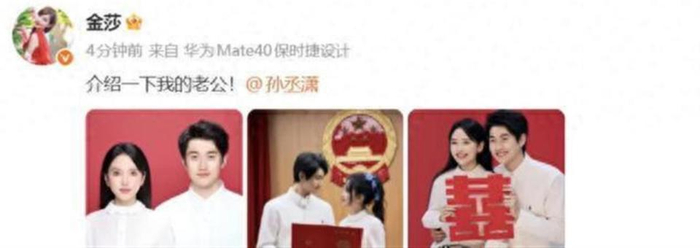 2026年2月13日,情人节前一天,两人在北京海淀区民政局领取了结婚证。 他们没有立刻公开,而是等到4月9日,两人共同参与的夫妻观察综艺《妻子的浪漫旅行2026》首播当天,才同步晒出红底结婚照,正式官宣。 金莎在节目里回应了“为上节目才结婚”的质疑,她说:“没有人会拿结婚这种人生大事来配合节目炒作。 ”