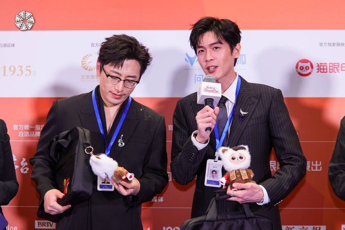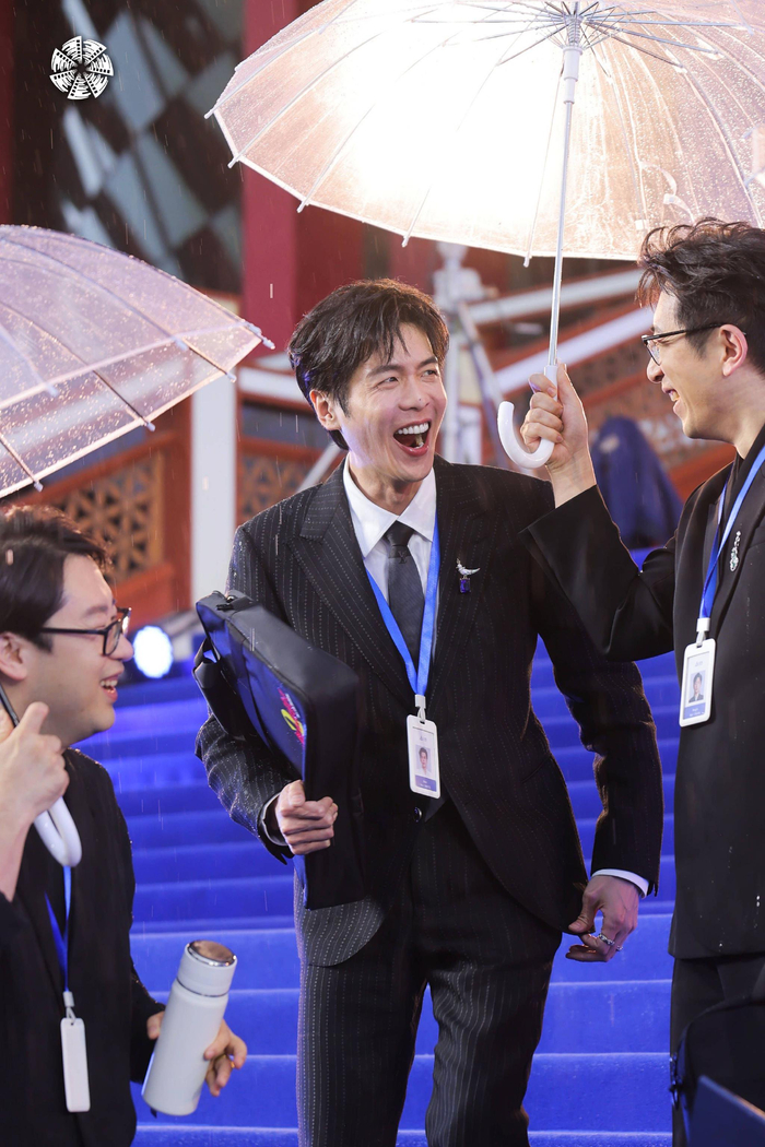 4月16日,《年会不能停2》剧组亮相第十六届北京国际电影节开幕式红毯环节,因现场降雨,白客为张若昀撑伞。