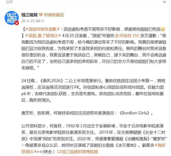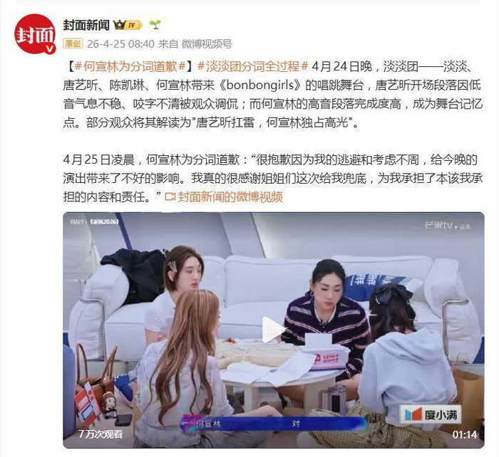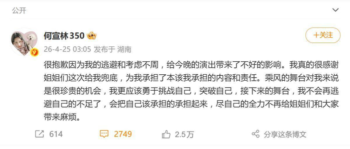 争议来得快,回应更快。4月25日凌晨,何宣林在社交平台发文道歉,语气诚恳且直接:“很抱歉因为我的逃避和考虑不周,给今晚的演出带来了不好的影响。我真的很感谢姐姐们这次给我兜底,为我承担了本该我承担的内容和责任。”她没有回避问题,而是主动把“逃避”和“考虑不周”这两个关键词摆上了台面,承认自己在分词环节上的处理不够成熟,让队友替自己承担了压力。